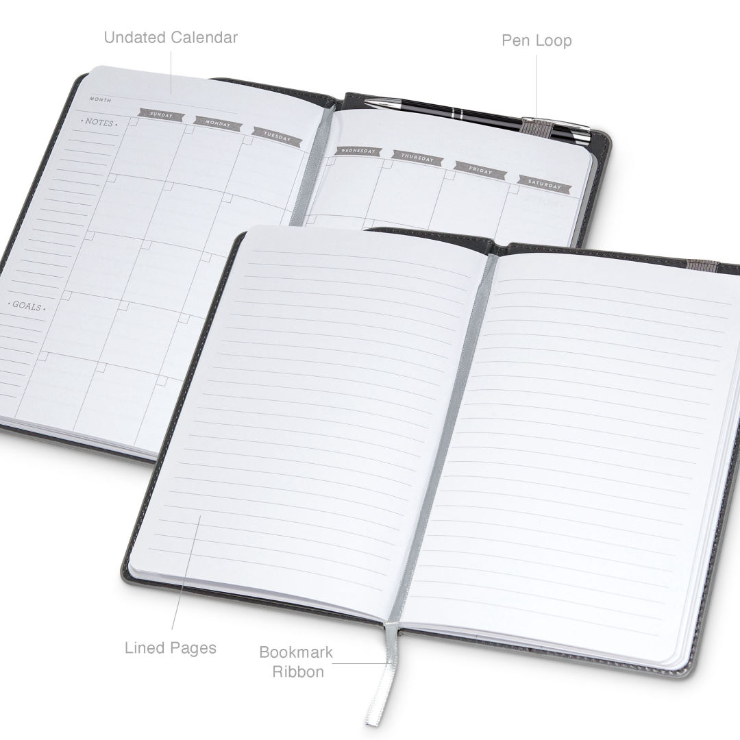 A modern twist on the classic thinker’s journal. A reliable travel companion, sure to inspire writings, thoughts and plans for the future.The Soca Journal Features…- Unique two-tone design with pen holder on the top- Vegan stitched leather cover- 192 white, lined pages- Acid-free 80 gram paper- Lay-flat binding- Bookmark ribbon- Top pen port- Cool gray endpages, *Belly Band & Promo Page Inserts Optional. See Decorating Info for details. 5.75″ W x 8.625″ H