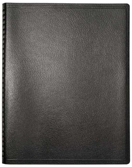 This calendar planner features a flexible leatherette or textured paper cover with 2 round corners. Metro covers are available for blind debossing or foil stamping. Inside sheets are made from 60 Lb. white offset paper and include 14 months (December to January), monthly and weekly views pre-printed in blue and gray with reference pages, and a white double pocket inserted in the back. Comes with semi-concealed black Wire-O binding on the left side. 8 5/8″ W x 11″ H