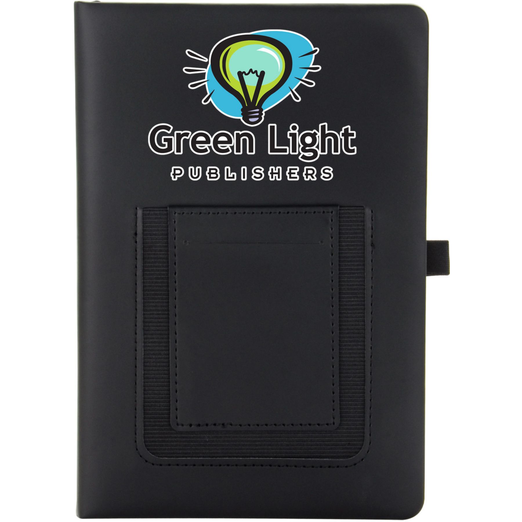 Keep Your Phone Close at Hand Even When in Meetings! Features a soft faux leather cover with an elastic smartphone pocket & business card slot. Includes 80 sheets (160 ruled pages) & ribbon page marker. Elastic pen loop on side of journal (pen sold separately). Pocket Inside Back Cover for Storing Documents. Imprint will be printed in full color above the pocket. Complies with Prop 65. 5.75″ W x 8.25″ H