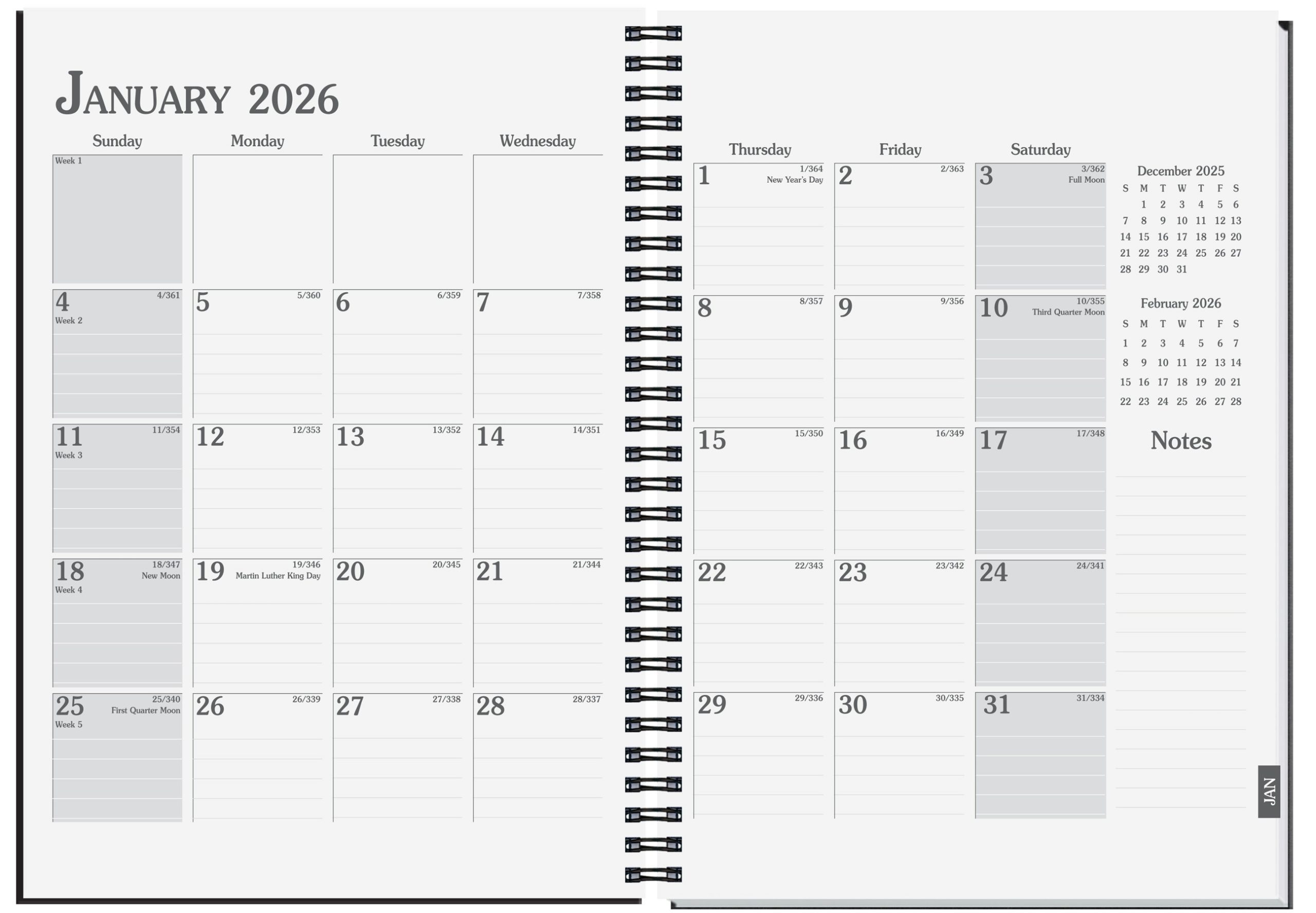 Hybrid 14-Month Journal Planner (December – January) combines style and functionality. This 7″ x 10″ planner features a sleek full-color gloss cover and a monthly calendar view for efficient scheduling. Spanning 14 months (December January), it also includes 50 journal pages with light gray ruled lines for notes and ideas. Wire-O bound on left side. It’s the perfect tool for organizations looking to keep their teams organized and productive throughout the year. 7″ L x 10″ W