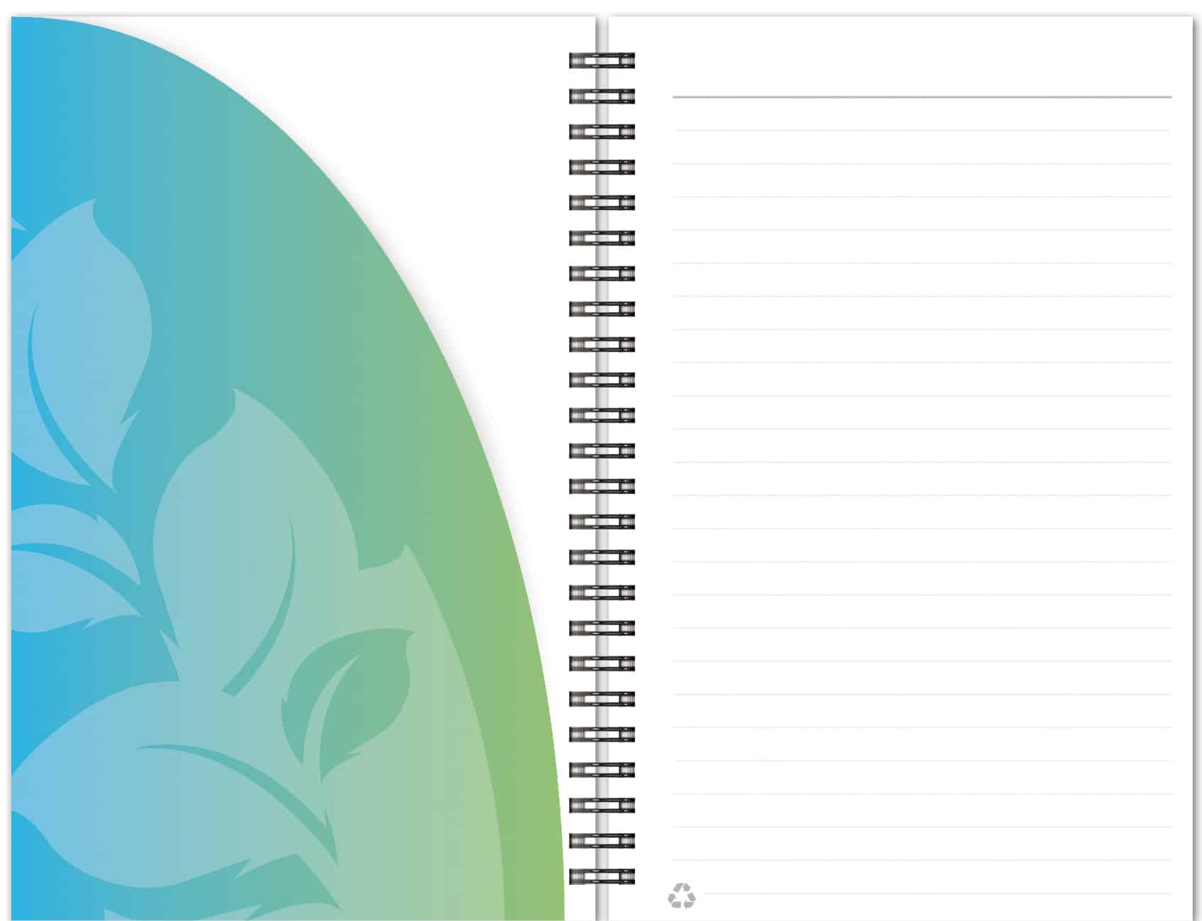 Flexible full-color front cover with gloss UV coat (matte film also available upon request). Features a built-in pocket inside front cover. Includes 70 sheets of lined filler and black paperboard back cover. Black wire binding. Complies with FSC. 5.8″ W x 8.5″ H